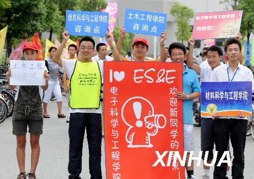 8月29日,东南大学的学生志愿者在迎接新同学。
