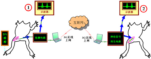 实验开始前,在南京东南大学射频与光电集成电路研究所实验室和北京中国康复研究中心脊柱脊髓损伤实验室各制备一只去头蟾蜍,使其俯卧。实验开始后,位于南京的东南大学参加实验的专家们用滴管将0.05ml 的5%醋酸滴到作为信号源的去头蟾蜍的左脚脚趾上,由于条件反射,该蟾蜍的左腿坐骨神经会诱发神经信号,左腿作出缩腿的动作。此时,在该蟾蜍坐骨神经上安装的具有信号采集作用的电极,检测到的蟾蜍左腿坐骨神经上的神经信号后,通过电脑的3G移动通信无线端口与互联网接通,设在千里之遥的北京中国康复研究中心脊柱脊髓损伤实验室内的电脑也通过3G移动通信无线端口接收来自互联网的信号,并经再生电路放大处理后,成为受控去头蟾蜍功能电激励用信号源,刺激受控去头蟾蜍的左腿坐骨神经,北京去头蟾蜍左腿同步产生了与南京蟾蜍类似的缩腿动作。