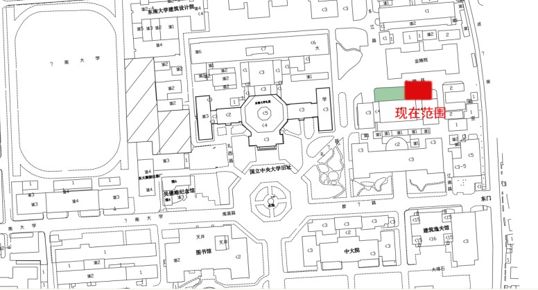 采访前记者通过收集相关资料得知:东南大学保存的校园历史地图《南京高等师范学校校舍图》上,始建于1918年的“工艺实习场”建筑一直保存至今,成为对校园历史建筑进行定位的关键参照。而今天仍保存完好的历史建筑“金陵院”,其前身即为中央大学医学院附属牙科医院,曾与化学教室同时存在,为邻近建筑,这也提供了第二份参照。东大建筑学院同学依托这两份参照,利用有关技术手段,将历史上“国立东南大学化学教室”的范围,在如今东大校园测绘图上标示了出来。