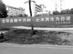 4月9日,有网友在人人网上称被东南大学土木工程学院这条横幅给震惊了。这是土木工程学院向女士表白的横幅,没想到引来不少建筑学院学生的“羡慕嫉妒恨”,于是,两院学生在网上用打油诗打起口水战,笑翻网友。