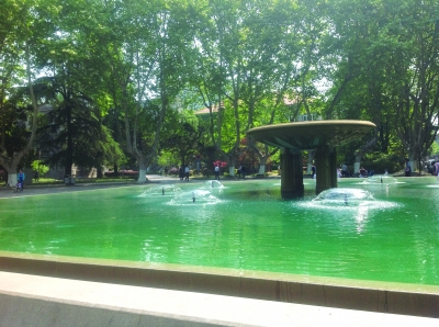 东大喷泉呈蓝绿色,原来加了神秘颜料