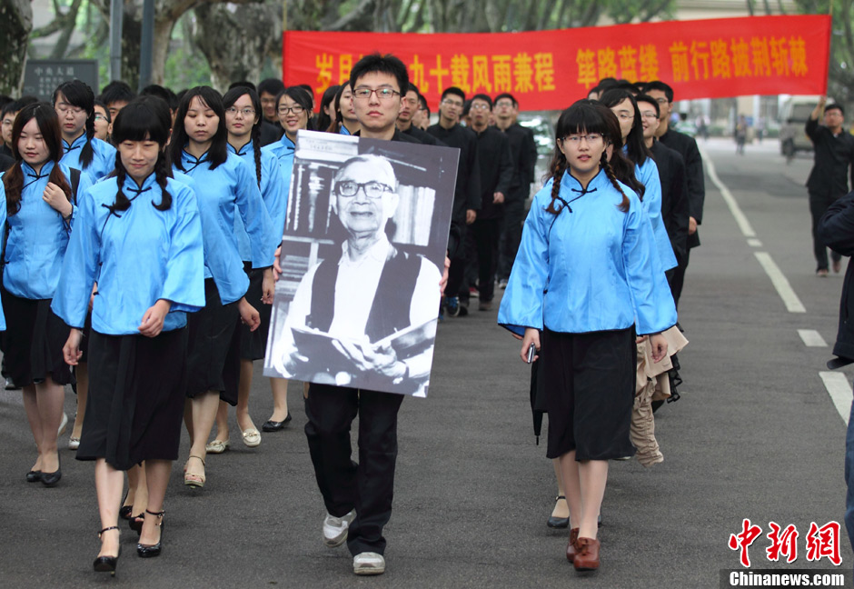5月18日,90名身着上世纪二十年代学生服的东南大学土木学院应届毕业生颁奖大会前以“我的梦、大师梦”为题,在茅以升当年曾驻足徜徉的校园内最古老的六朝松下宣讲,缅怀先师、承继理想,让梦想再次起航。中新社发泱波摄