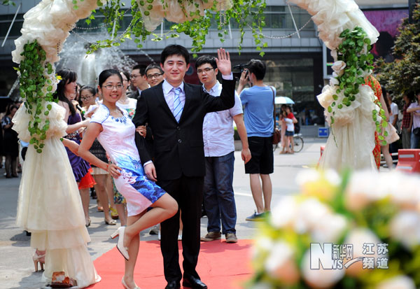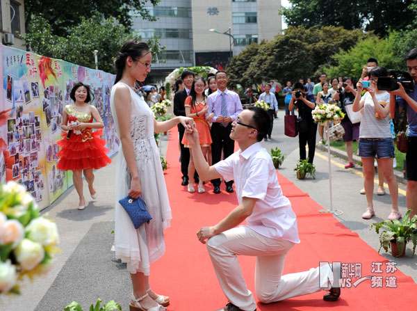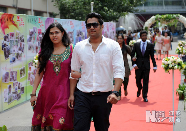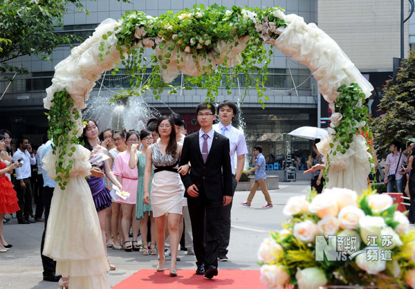 新华网江苏频道南京6月18日电 6月17日,南京东南大学医学院举办“似水流年,医路同行”2013届毕业生毕业典礼,445名中国毕业生、125名外国留学生毕业生参加红毯走秀、签名纪念、校园留影等活动。在“医路同行”走秀仪式中,同学们以男女携手同行的形式,展示浪漫风采,纪念青春时光。一些同窗情侣在活动现场表达一生相爱之情。新华社记者孙参摄