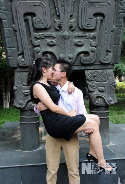 一对参加毕业庆祝活动的同窗情侣在校园里的铜鼎前温情留影。