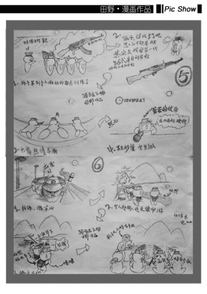 记者看到,田野的漫画很有个性,都是用铅笔手绘的形式创作的,画作截取了军训中一个个大家熟悉的场景,然后编写出一个个令人轻松诙谐的小故事。如描写“体能训练”场景的一组漫画中,威严的教官面无表情,学子们在教官的“淫威下”被迫做着深度下蹲、背砖俯卧撑等种种高难度动作,个个痛苦得面目狰狞,一脸苦相。引得观看者忍不住笑得前仰后合,“这也太夸张了吧,但是这种场景好像就在眼前,好怀念啊!”