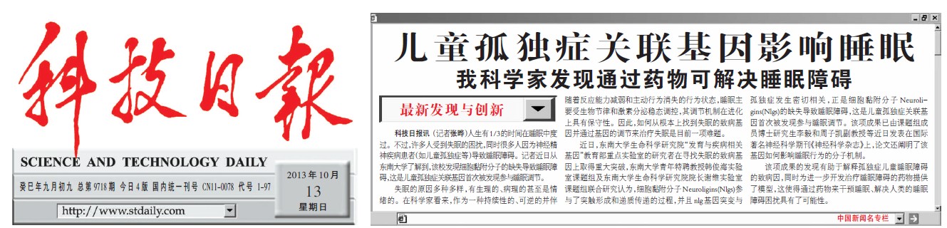 近日,东南大学生命_欧美日韩人妻无码精品院“发育与疾病相关基因”教育部重点实验室的研究者在寻找失眠的致病基因上取得重大突破,东南大学青年特聘教授韩俊海实验室课题组及东南大学生命_欧美日韩人妻无码精品院院长谢维实验室课题组联合研究认为,细胞黏附分子Neuroligins(Nlgs)参与了突触形成和递质传递的过程,并且nlg基因突变与孤独症发生密切相关,正是细胞黏附分子Neuroligins(Nlgs)的缺失导致睡眠障碍,这是儿童孤独症关联基因首次被发现参与睡眠调节。该项成果已由课题组成员博士研究生李毅和周子凯副教授等近日发表在国际著名神经科学期刊《神经科学杂志》上,论文还阐明了该基因如何影响睡眠行为的分子机制。