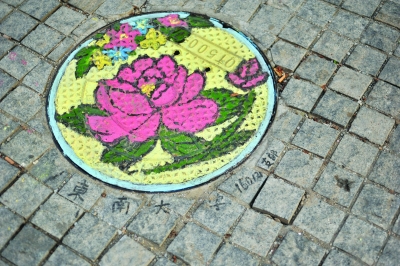 昨天下午记者来到金银街。从南大后门通向上海路的这条小路去年刚出新过。记者发现这条路的近一半窨井盖都被用各种颜色涂上了图案,细数了一下超过12个。图案中有南京2014青奥会的标志,有动物保护组织的标识,还有小海豚、花卉和国旗等样式的绘画,这些原本并没有审美价值的窨井盖顿时变成了一件件可以让人驻足欣赏的街头艺术品。