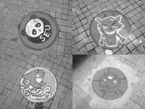 “南京大学附近的金银街,十几个窨井盖出现了一些很萌的涂鸦:青奥、灰太狼、熊猫、脚丫、NBA火箭等等,涂鸦旁边依稀可见‘东南大学’的字样。”日前,如此一则微博在网络出现,据爆料,在南京大学鼓楼校区商学院安中楼门前的金银街上,出现了十几个各具特色、艺术鲜明的窨井盖,但令人费解的是,每幅作品的下面都标注了“东南大学”几个字。