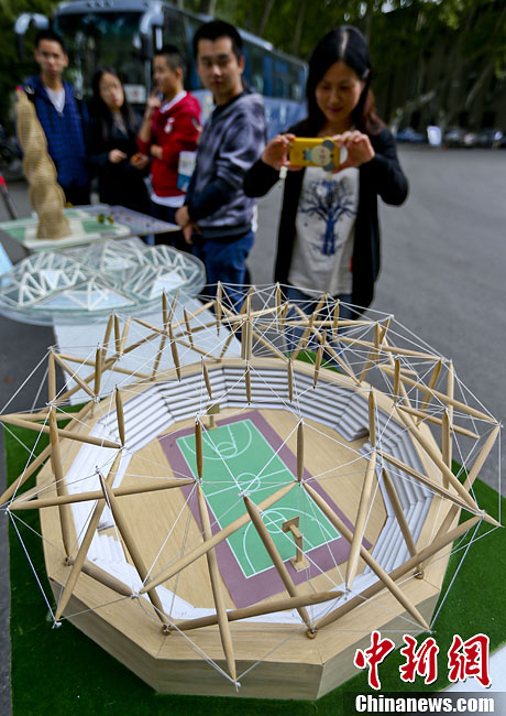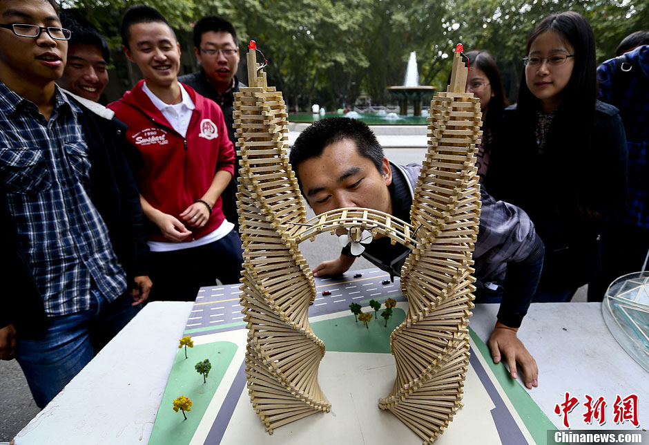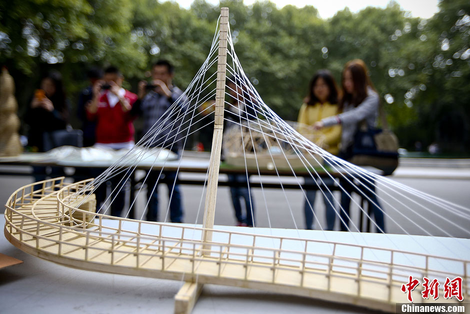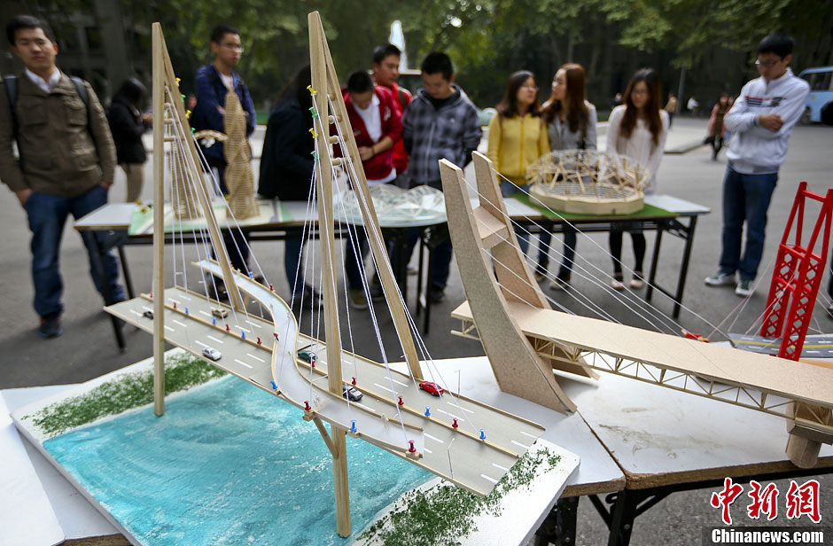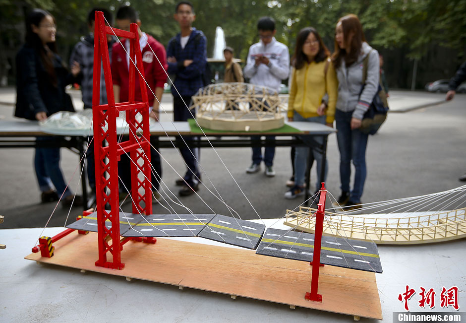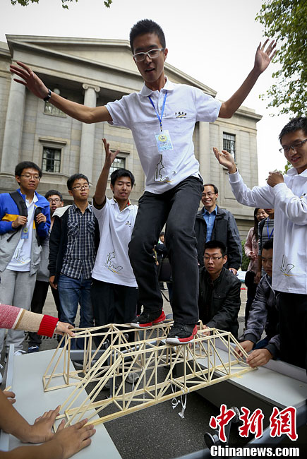 10月17日,南京东南大学土木工程学院科技协会的学生在四牌楼校区大礼堂前举办桥梁结构模型展示及趣味性加载活动,喜迎10月20日即将举行的土木工程学科创建暨土木工程系成立90周年庆典。学生们将自己设计的各种桥梁模型、场馆模型一一展示,同时现场用细木头搭设的两座模型桥梁,竟然可以承受近70公斤的人站在上面,令围观的学生大开眼界。据悉,东南大学土木工程学科是1923年由著名桥梁专家茅以升先生创建。中新社发 泱波 摄