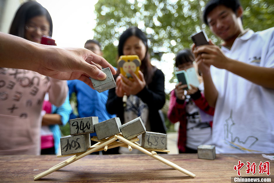 10月17日,南京东南大学土木工程学院科技协会的学生在四牌楼校区大礼堂前举办桥梁结构模型展示及趣味性加载活动,喜迎10月20日即将举行的土木工程学科创建暨土木工程系成立90周年庆典。学生们将自己设计的各种桥梁模型、场馆模型一一展示,令围观的学生大开眼界。据悉,东南大学土木工程学科是1923年由著名桥梁专家茅以升先生创建。图为学生用18根一次性筷子搭建的简易桥梁承载着近十斤的铅块依然不倒。中新社发 泱波 摄