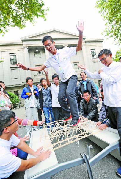 一名体重近70公斤的学生站在总共用50根细木条制作的一组桥梁结构模型上,展示模型的承重能力。