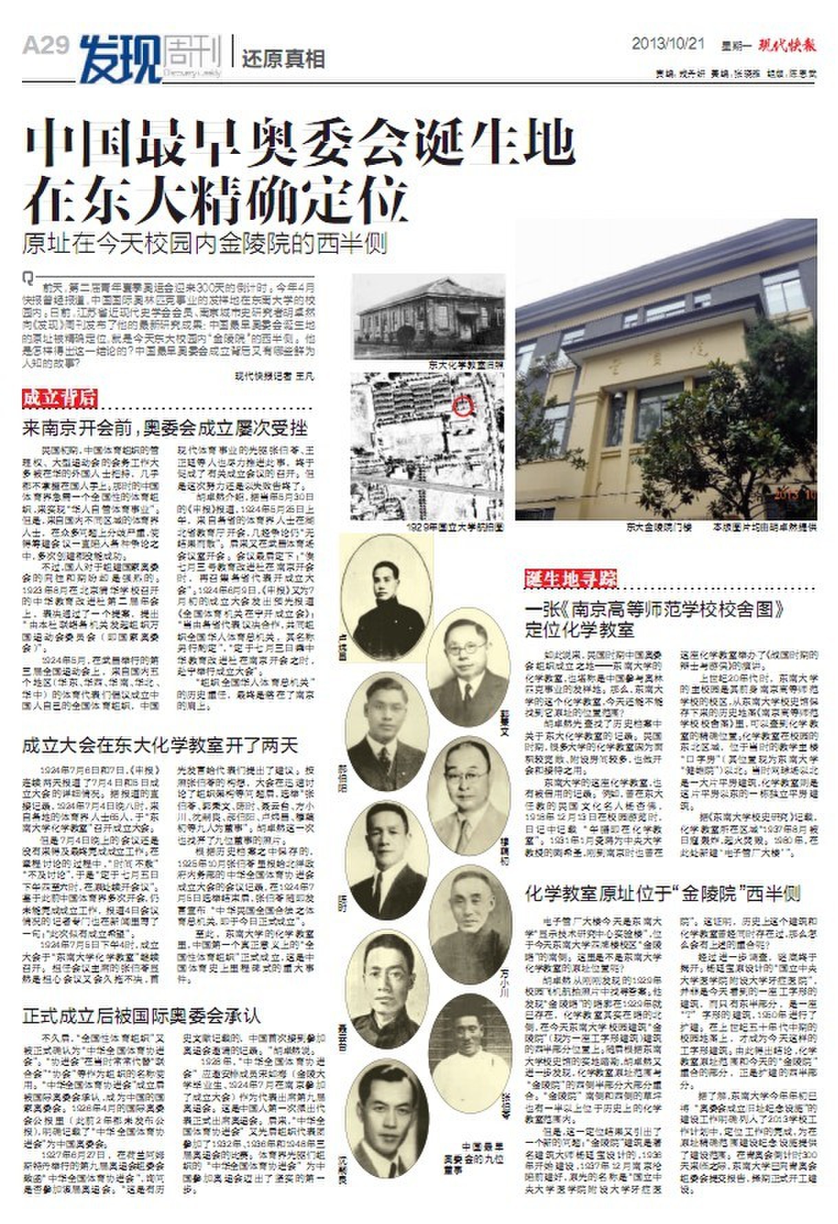 前天,第二届青年夏季奥运会迎来300天的倒计时。今年4月快报曾经报道,中国国际奥林匹克事业的发祥地在东南大学的校园内。日前,江苏省近现代史学会会员、南京城市史研究者胡卓然向《发现》周刊发布了他的最新研究成果:中国最早奥委会诞生地的原址被精确定位,就是今天东大校园内“金陵院”的西半侧。他是怎样得出这一结论的?中国最早奥委会成立背后又有哪些鲜为人知的故事?