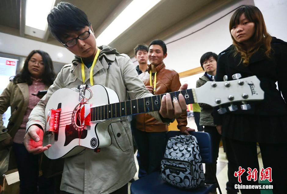 11月23日,由江苏省高校大学生物理及实验创新竞赛组织委员会主办、东南大学教务处和物理系承办的江苏省高校第十届大学生物理及实验科技作品创新竞赛在东南大学举行。来自省内42所高校的234项作品跻身物理论文及实验制作两大类决赛答辩,展现了江苏高校大学生在物理学科的创新水平与实践技能。图为一位参赛学生展示基于单片机和激光的发射与接收、语音模块的工作原理设计制作而成的“无弦吉他”。泱波 摄