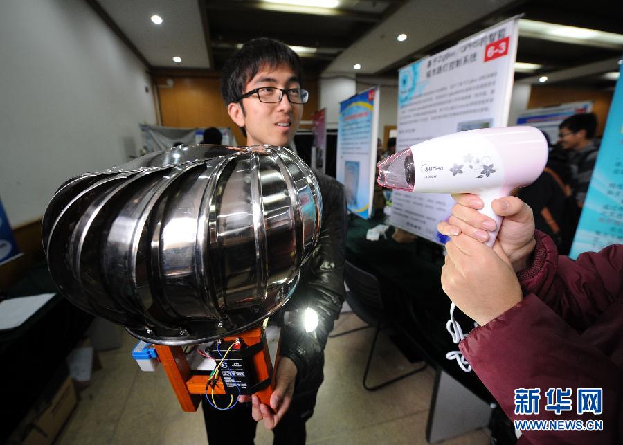 11月23日,来自东南大学吴健雄学院的参赛学生在演示其研制的“垂直轴风力发电、储能与照明装置”。