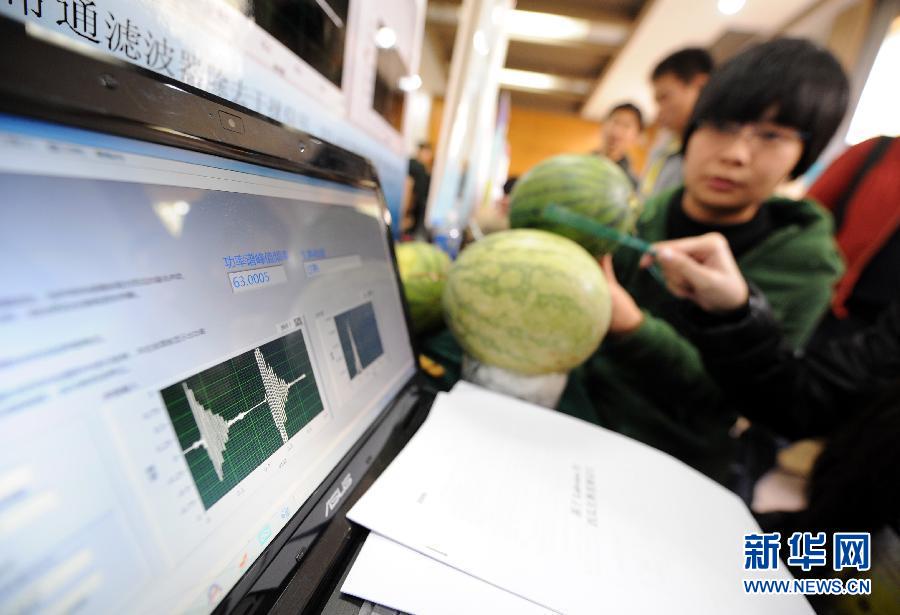 11月23日,来自扬州大学电子信息科技专业的参赛学生在展示她们研制的“西瓜生熟度测试仪”,利用这种仪器,只要敲打西瓜获取其声音频谱,就可帮助人们判别西瓜的成熟程度。
