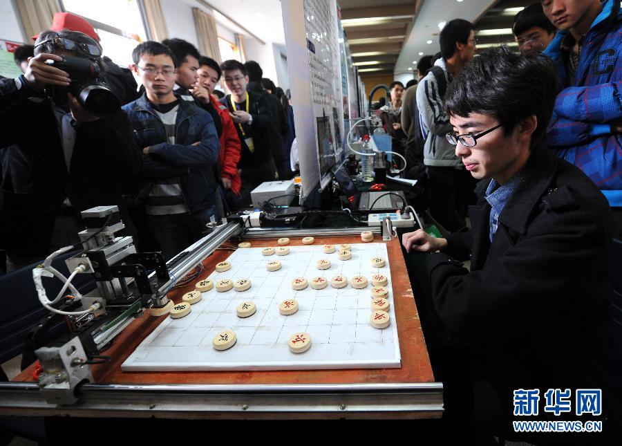 11月23日,来自常州大学电子科技专业的段旭在与他研制的“智能型实物棋盘人机对弈机器人”下棋,该机器人可感知棋局信息变化,并活动其三维机械臂自动移子、吃子,而且棋技高超。