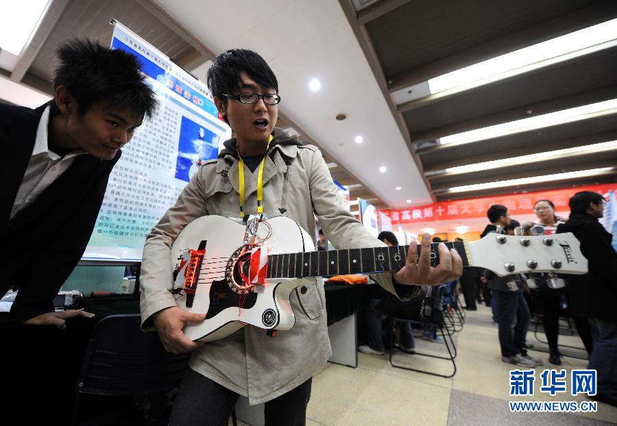 11月23日,来自江苏淮海工学院光信息科技专业的参赛学生颜禄浩(右)在展示他运用激光感知技术研制的“无弦吉他”,可模拟电吉他、木吉他发音,音准识别性强。