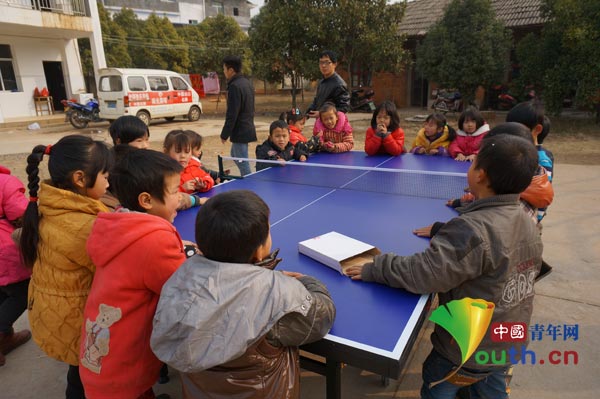 为了尽快让孩子们能够有体育设施玩,在第一批物资到位后,团共青城市委立即组织支教老师租车把这些物资送往坪塘小学。当支教老师把篮球,排球,跳绳,羽毛球,乒乓球等体育器材拿出来送给他们时,孩子们兴奋的都炸开了锅,高兴的手舞足蹈,虽然他们当中有不少人还没有学过怎么打球,但还是有模有样的挥着球拍。内蒙的一位爱心哥哥捐赠了两张乒乓球台,支教老师在说明书的帮助下为孩子们把两个乒乓球搭建组装好,孩子们很兴奋的打起了比赛,坪塘小学的老师们和下课的孩子们都围了过来,好奇的观看比赛。