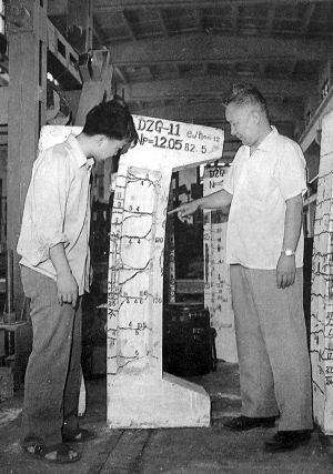 然而就在这得心应手、梦想得以实现的时候,文化大革命爆发,丁大钧一夜间成了“反动学术权威”,大字报、大批判铺天盖地。面对这种遭遇,丁大钧心里还是惦记着试验,不管白天黑夜挨多少批斗,他每天还是要偷偷坚持到试验室亲自观测并记录数据。因为长期荷载试验的观测数据是不能中断的,每天早中晚和春夏秋冬一年四季的温度、湿度变化对刚度裂缝的影响规律是最重要的,一旦观测中断,数据不连续就意味着试验研究失败,多年心血付之东流。