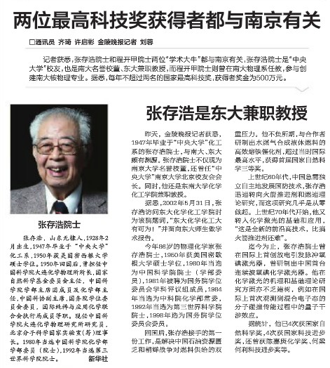 昨天,金陵晚报记者获悉,1947年毕业于中央大学化工系的张存浩院士,与南大、东大颇有渊源。张存浩院士不仅现为南京大学名誉校董,还曾任中央大学南京大学北京校友会会长。同时,他还是东南大学化学化工学院兼职教授。