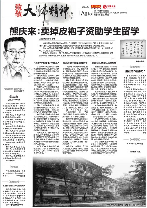 当时的大学生家境贫寒,熊庆来总是想尽一切办法帮助他们。他发现一个叫刘光的学生很有才华,经常指点他读书、研究。后来和另一位教过刘光的教授共同资助刘光出国深造,并且按时给他寄生活费。有一次,熊庆来卖掉自己身上穿的皮袍子,给刘光寄钱。