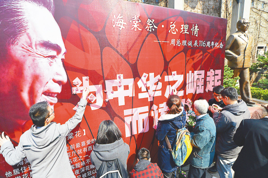 5日是周恩来诞辰116周年纪念日,社会各界纷纷来到南京梅园新村纪念馆,以各种形式缅怀伟人光辉的一生。图为南京东南大学土木工程学院的大学生在周恩来雕像前举办“海棠祭·总理情”纪念活动。 本报记者 万程鹏摄