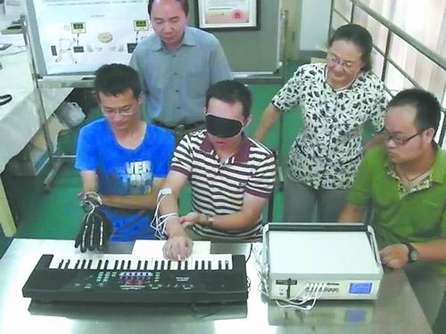 王志功和学生利用“神手”装置开展遥控五指弹琴实验。