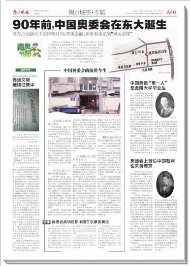 日前,有南京本地学者考证出,奥委会工作人员就在鼓楼区匡庐新村12号办公。研究此事的江苏省近代史学会会员、南京市地方志工作者胡卓然建议,青奥会前,应在这些见证历史的重要地点,树碑立文。“要告诉各国小选手们,南京不仅有先进的场馆与服务,这里也是中国奥运梦起源的地方。”