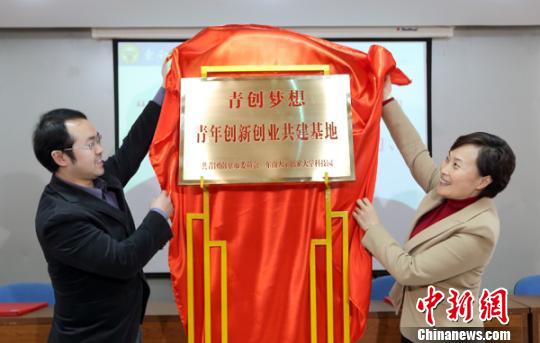共青团南京市委书记单晓峰与东南大学党委副书记兼副校长刘波(右)共同为“青创梦想创新创业基地”揭牌。 泱波 摄