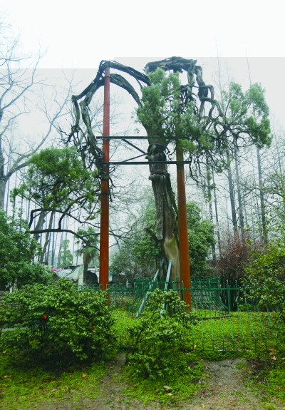 2012年初的一场大雪,压折了六朝松仅存的树冠,枝叶连筋带骨耷拉了下来。开春后,东南大学请来南京市盆栽研究会的专家,用雕琢盆景的技术给这个折枝“打石膏”,目前这个捆绑的外套仍在枝上。