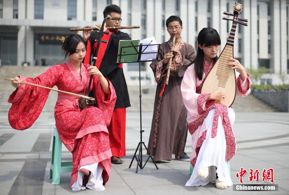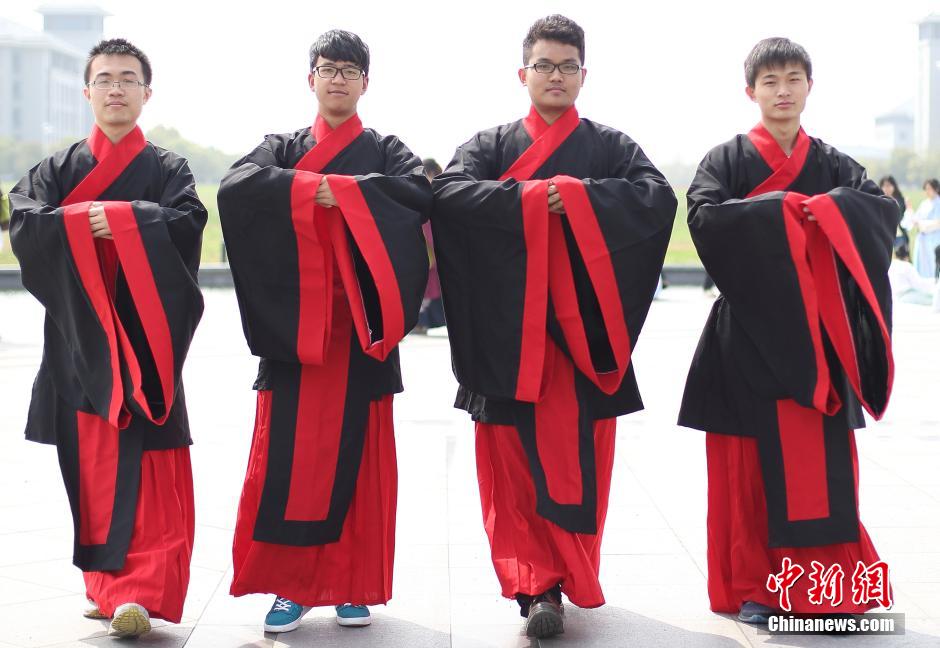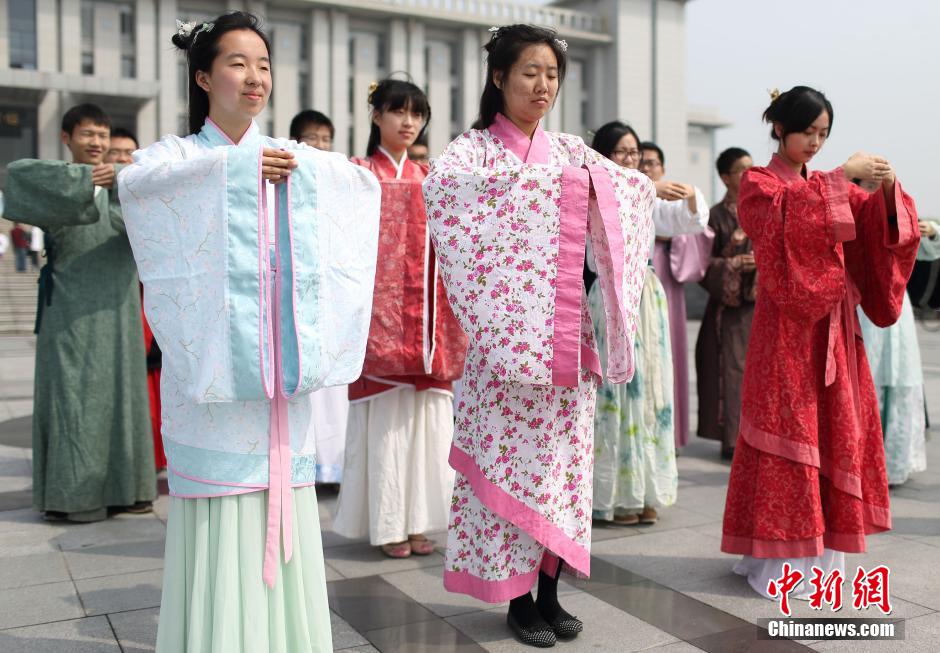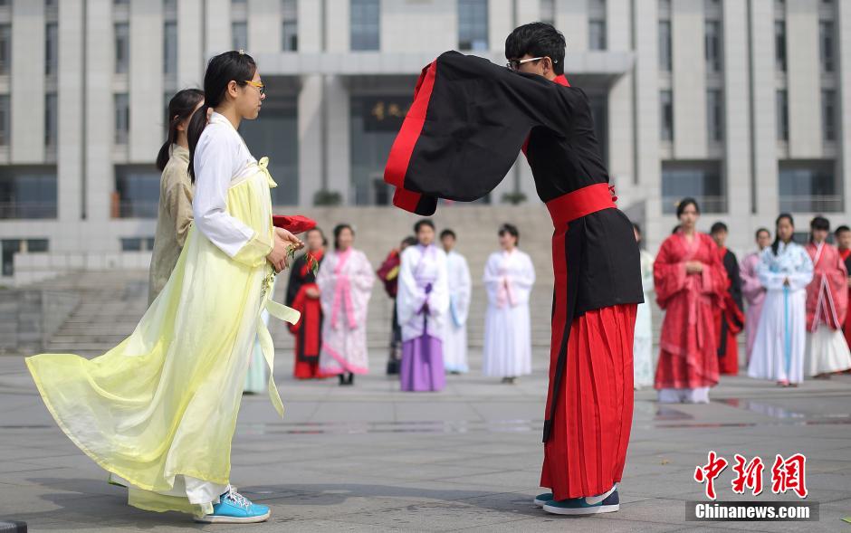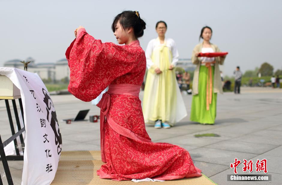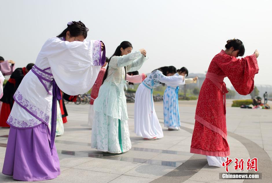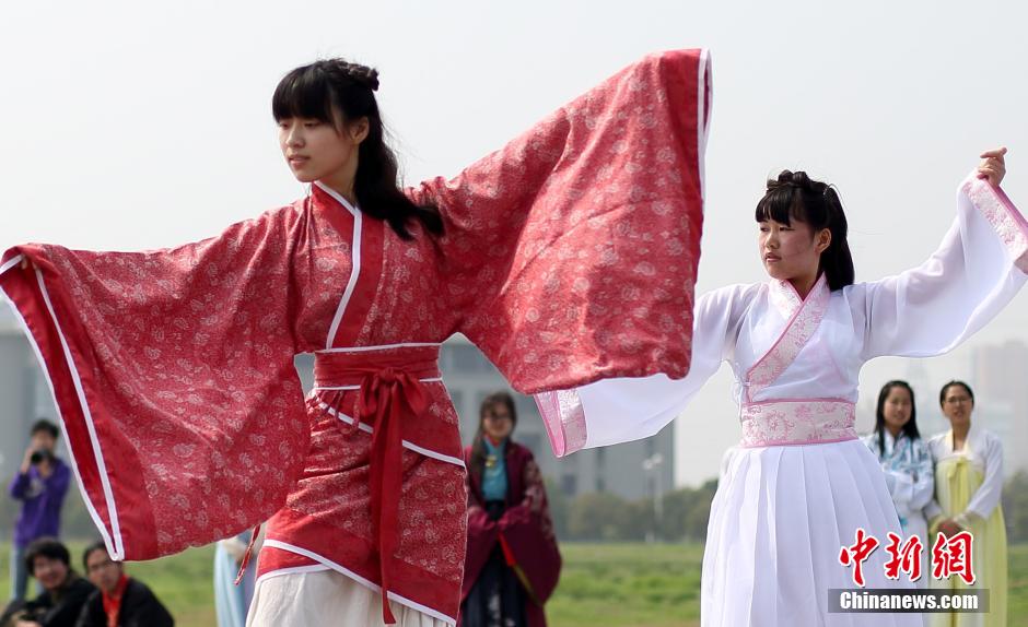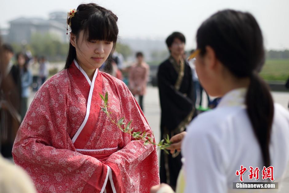 3月30日,身着汉服的大学生在进行“上巳节”仪式。当日,南京东南大学华风汉韵文化社和051121、051122班级的汉文化爱好者们身着传统汉服,在该校九龙湖校区举行“祓禊”、汉舞表演等仪式和节目,体验“上巳节”(农历三月初三)传统文化。中新社发 泱波摄