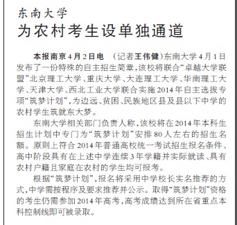 东南大学相关部门负责人称,该校将在2014年本科生招生计划中专门为“筑梦计划”安排80人左右的招生名额。原则上符合2014年普通高校统一考试招生报名条件、高中阶段具有在上述中学连续3年学籍并实际就读、具有农村户籍且家庭在农村的学生均可报考。