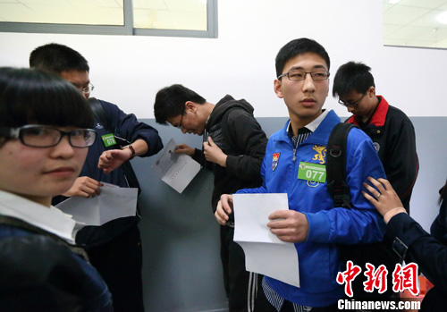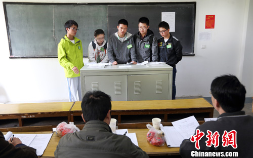 4月7日,参加自主招生面试的考生在考场内参加无主持有主题讨论。中新社发 泱波 摄4月7日,参加自主招生面试的考生在考场外等候进场面试。中新社发 泱波 摄