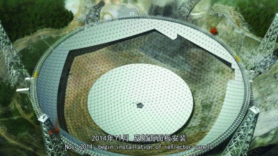 宣传片里,6个支撑塔高高竖起,网格逐渐爬满了“锅”底,向上延伸“咬住”环梁,接着反射面面板一圈一圈铺满索网的空隙,一张巨大的网就织好了。