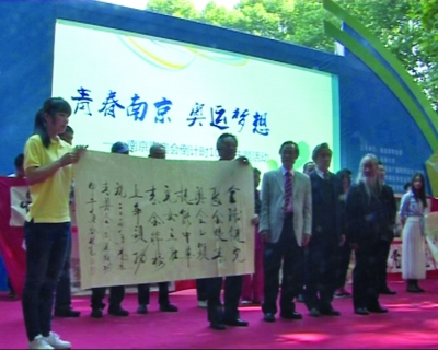 在临时搭建的“青春南京、奥运梦想——南京青奥会倒计时100天大型主题活动”展台前,大批的大学生志愿者聚集在一起。一场热力四射的志愿者舞蹈之后,艺术名家百米长卷首次呈现仪式举行。中国美术家协会理事、中国工笔画学会副会长喻继高,江苏省美术家协会副主席尹石、江苏省花鸟画研究会会长徐培晨、山水画名家叶维、青少年代表程夕窈等共同展示了百米长卷。现场还特别展示了“水墨行走,感动青奥”艺术总顾问喻继高先生为祝福青奥特别题写的诗一首:“全球健儿聚金陵,青奥会上显技能,中华儿女立壮志,金牌榜上立头功”。在接下来的青奥水墨行走时间里,百米长卷将随着水墨行走活动,走出南京和江苏,走向全国各地,宣传青奥,一直持续到8月归来。