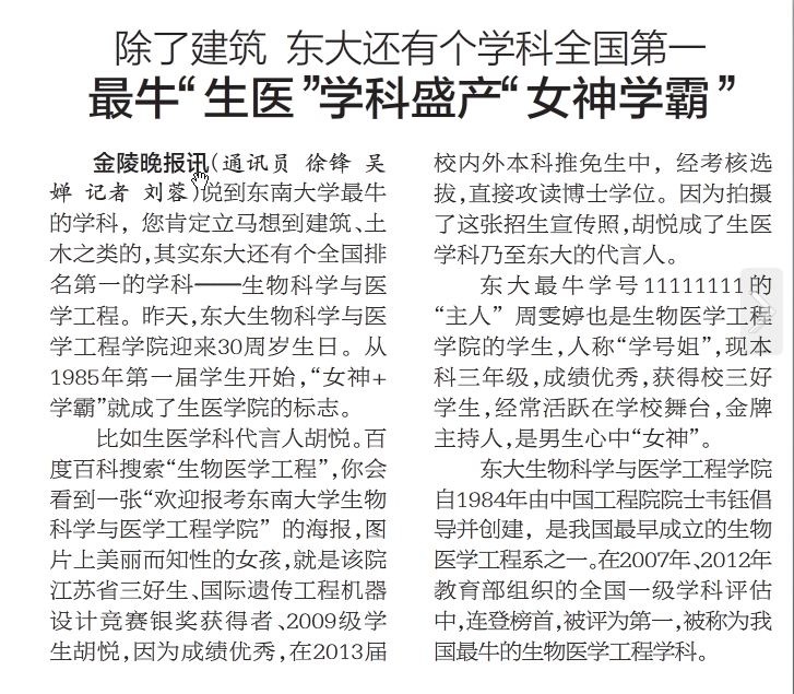 【金陵晚报】东大最牛“生医”学科盛产“女神学霸”