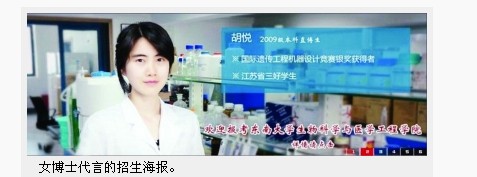 百度百科搜索“生物医学工程”,你会看到一张“欢迎报考东南大学生物科学与医学工程学院”的海报,图片上美丽而知性的女孩,就是该院江苏省三好生,国际遗传工程机器设计竞赛银奖获得者,2009级学生胡悦,因为学业成绩优秀,在2013届校内外本科推免生中,经考核选拔,直接攻读博士学位。因为拍摄了这张招生宣传照,胡悦成了生医学科乃至东大的代言人。昨天,穿着红色T恤的胡悦清纯亮相,受到学弟妹的追捧,“拍那张照片时我恰好在做实验,师弟拿着相机喊了我一声,我一回头,咔嚓咔嚓照下来了。”2011年入学的最牛学号11111111的女生周雯婷也是生物医学工程学院的学生,人称“学号姐”,现本科三年级,成绩优秀,获得校三好学生,经常活跃在学校舞台,还是金牌主持人,男生心中“女神”。
