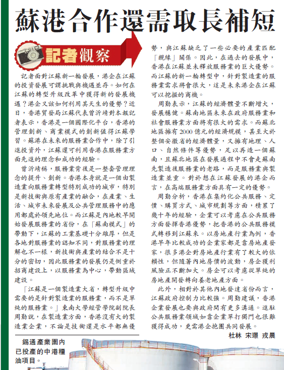 周勤表示,江苏的经济体量不断增大,发展稳健。苏南地区未来在政府服务业和社会服务业方面将有很大的需求。而苏北地区拥有2000亿元的经济规模,甚至大于整个安徽省的经济体量,又拥有地理、人口、自然条件等优势,足以再造一个苏南,且苏北地区在发展过程中不会走苏南先制造后服务业的老路,而是服务业与制造业并重。对于想在江苏发展的港企而言,在高端服务业方面具有一定的优势。