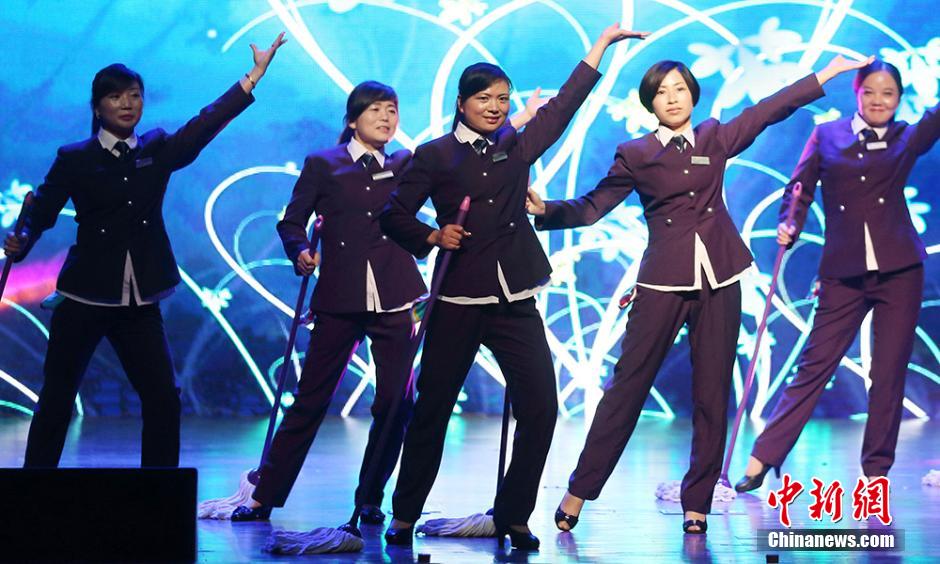 6月7日晚,以发掘高校校园内各路拥有才艺的达人、给予他们一个充分展现自我的舞台,尽情展现积极向上、创意无限的“达人精神”,由共青团东南大学委员会主办,共青团土木工程学院委员会、东南大学土木ACE艺术团承办的“筑森国际·东南达人秀”在南京九龙湖畔上演,铿锵有力的光影武术、别具一格的萨克斯重奏、响彻会场的清唱团、物业大叔大妈们的集体舞、光着脚丫的留学生们的印度舞蹈……为在场的师生们送上了一份来自民间达人们的饕餮盛宴。图为保洁员阿姨们带着拖把跳起舞蹈。泱波 摄