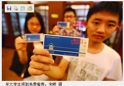 为庆祝校庆,昨天东大还请了3万余名在校生免费吃饭,其中本科生16721份、研究生13500份。东大的吴同学向记者展示了刚刚领到的免费餐券,一张淡绿色的小卡片,乍一看像一支淡雅的书签。餐券设计得很有艺术范儿,一面印着繁体的“于”字,另一面则画着一棵古松,清新脱俗。“同学们领到的餐券上面写着不同的字,有的是‘止’,有的是‘至’,有的是‘善’,拼起来就是东大校训‘止于至善’;而那棵松树则是东大标志性古树——1400岁的六朝松。”吴同学告诉记者,这顿免费的饭非常丰盛,有三大荦,还有若干蔬菜和水果、酸奶。