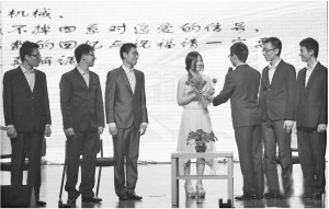 “无线谷的班车娇滴滴的学妹,都不如,初见你的笑靥”,“无所不在的,除了空气、阳光、电磁波,就是你的美”……8名男生手持玫瑰从舞台两边上台,依次念起了情诗,向张老师献上了红玫瑰。听着学生们的表白,事先不知情的张文蝶惊喜地捂住了嘴巴。舞台下的后援团报以热烈的掌声和欢呼声。男生们送上了“表白”:“蝶姐我们爱你,你永远是我们心中的蝶姐。你还没有男朋友,我们都是你的粉丝。”