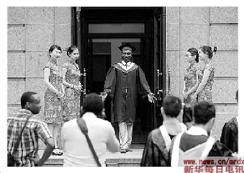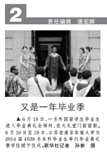 ▲6月18日,一名外国留学生毕业生进入毕业典礼会场时,在大礼堂门前留影。6月18日至19日,江苏省南京东南大学为2014届4039名本科毕业生举行毕业典礼暨学位授予仪式。