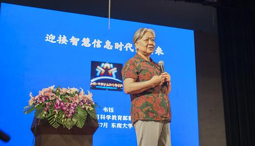 7月15日,中国工程院院士韦钰在开营仪式结束后作《迎接智慧信息时代的到来》的科普报告。新华社记者陈益宸摄