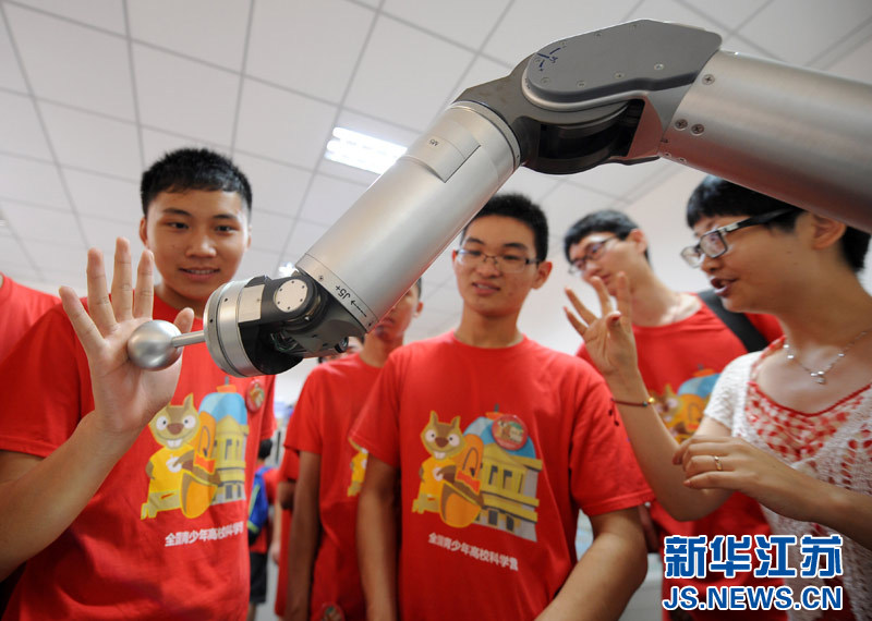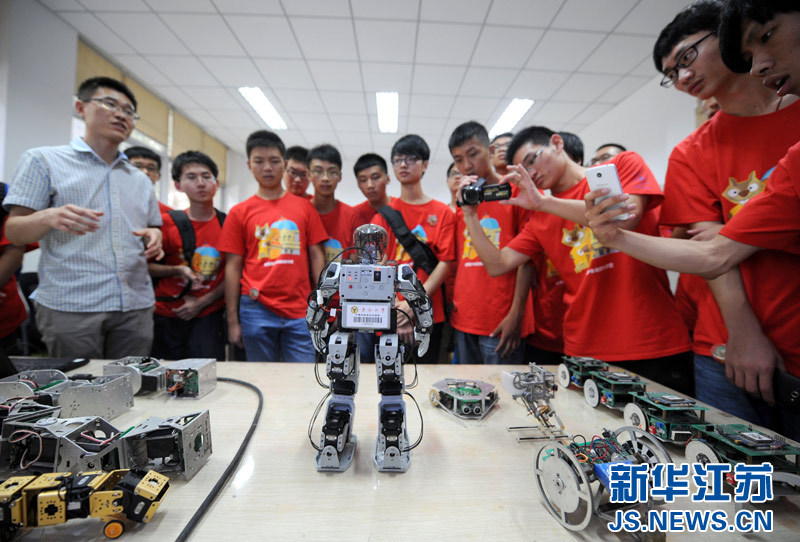 7月15日,营员们在东南大学智能机器人实验室里参观机器人。当日,“2014年全国青少年高校科学营”的江苏科学营在南京东南大学开营。东南大学为科学营安排了名家讲座、科学实验、科技竞赛、参观体验、社团互动等约30项活动,让营员们了解和体验科技创新。新华社记者 孙参 摄