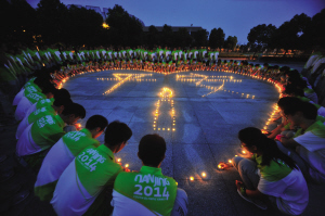 昨晚,东南大学的800多名青奥会志愿者在九龙校区举行了青奥会出征仪式。仪式后,志愿者们自发为昆山爆炸和云南地震事件中的伤亡者点蜡烛祈福。记者 邵丹 摄影报道