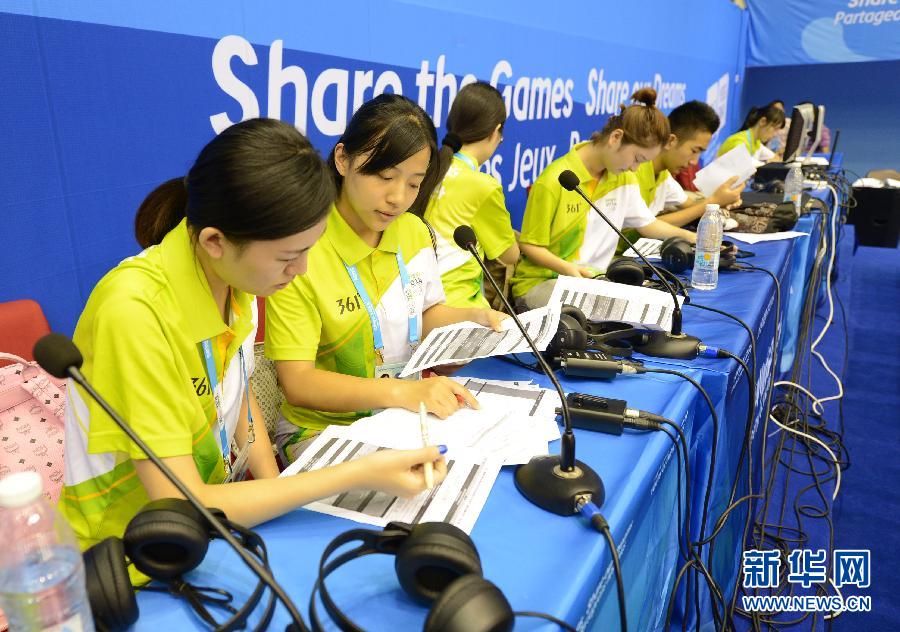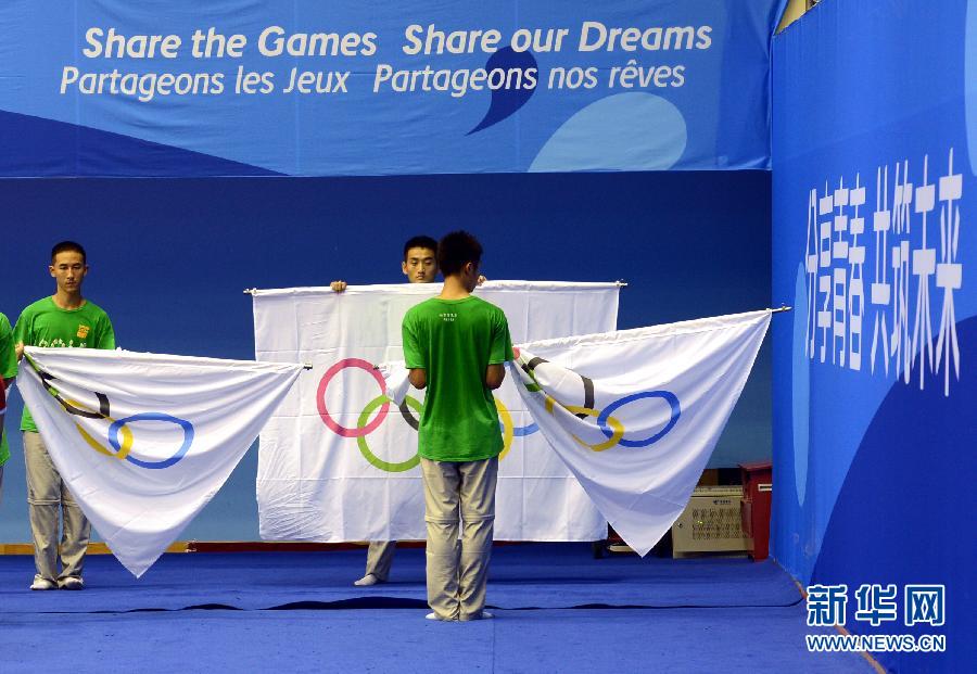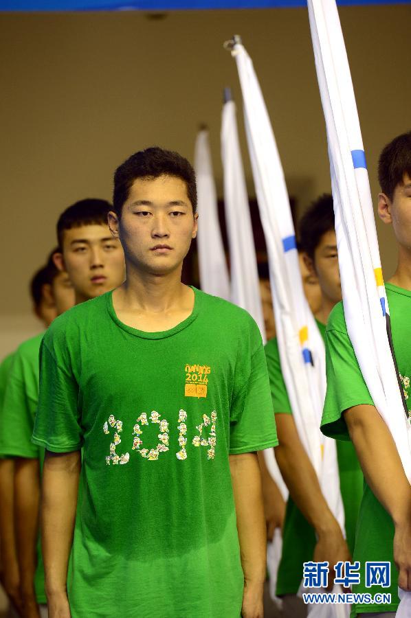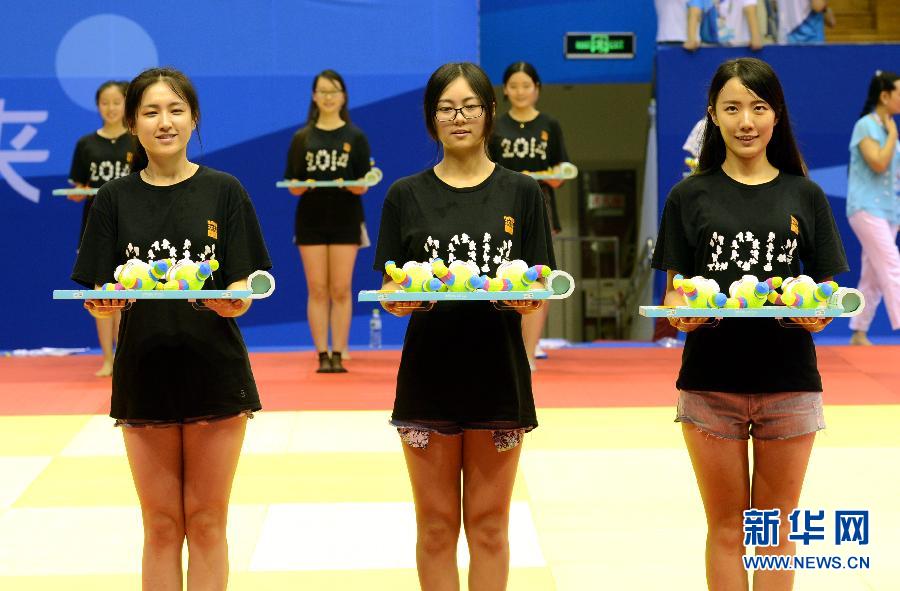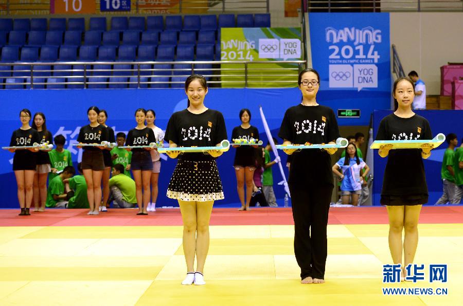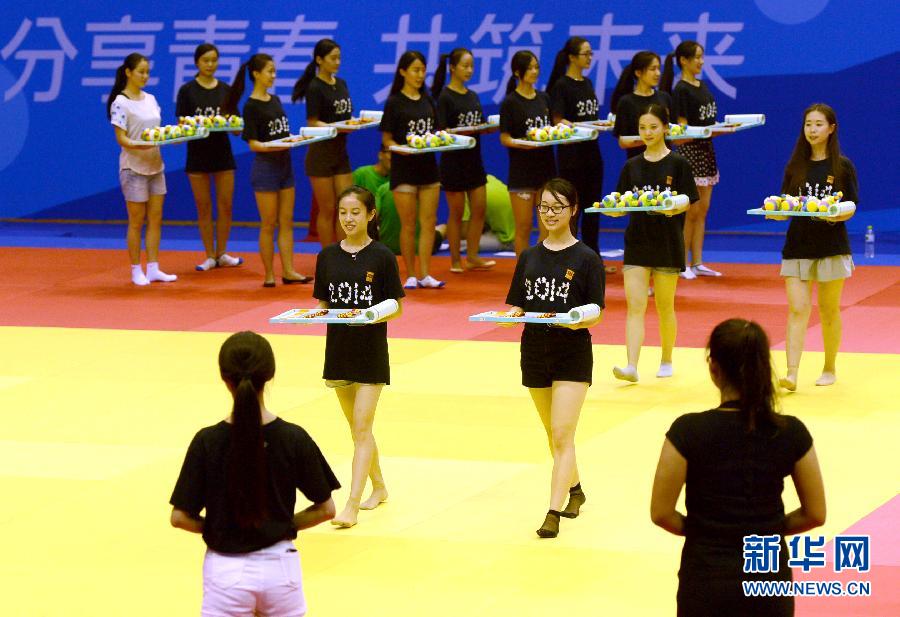 8月4日,在南京青奥会柔道、摔跤比赛场地——南京龙江体育馆,从事颁奖礼仪工作的志愿者进行训练。随着南京青奥会临近,担任赛场礼仪、服务、播报、物资管理等各项工作的志愿者正加紧进行实地岗位流程培训。新华社记者孙参摄