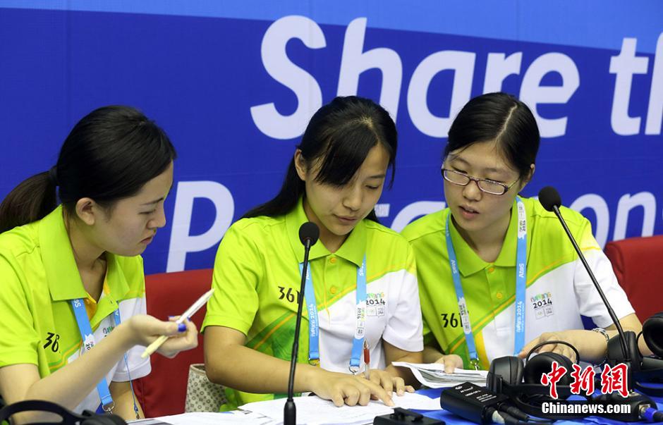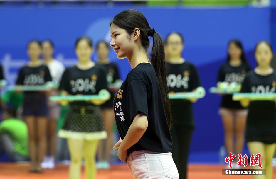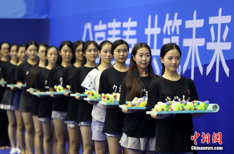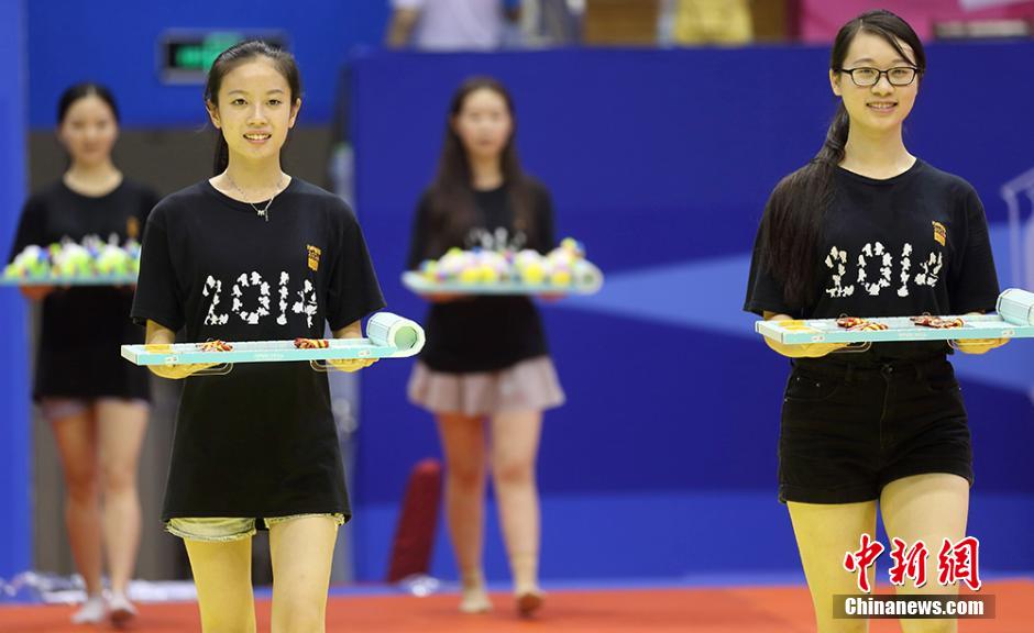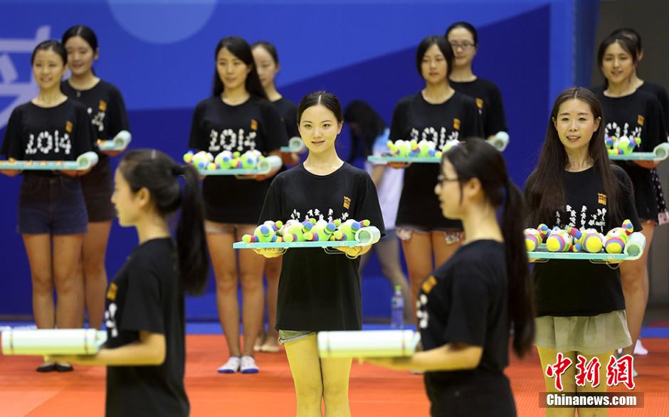 8月4日,在南京龙江体育馆,来自东南大学的颁奖礼仪志愿者们忙着进行联排,为即将开赛的青奥会比赛作准备。随着南京青奥会的日益临近,担任赛场礼仪、服务、物资管理等各项工作的志愿者们正加紧进行实地岗位流程培训。南京青奥会将于8月16日至28日举行,共设28个大项222个小项,届时将有204个国家和地区的3808名15至18岁的青年运动员参赛。泱波 摄