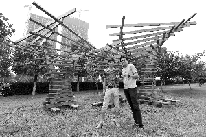 和亮相南京街头的青奥雕塑不同的是,它们并非出自大师之手,而是两名大四学生的创意之作。东南大学建筑专业大四学生张骐跃和何之凡的这组景观小品《梧桐树下》,是去年暑假着手设计的。张骐跃笑称,实地搭建前,他和何之凡到处“化缘”,到其他同学那里收集废木料,算下来,实验用的木料就有100多米。