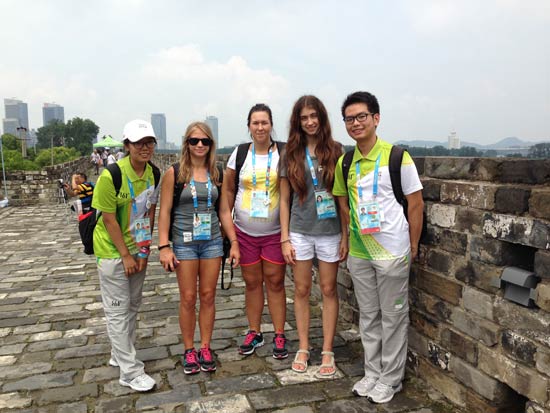 作为本届青奥会文化教育项目的组成部分,运动员们可以参观明城墙,现场动手烧制城墙砖并刻上自己的名字留念。看着亲手烧制的城墙砖,运动员们都很兴奋。下了城墙,颜静韬带客人们坐观光游览车环玄武湖一周。“这个湖真大,如果没有乘车,那我们就惨啦……”一个队员说,他们被玄武湖“接天莲叶无穷碧”的美景深深吸引,惊讶于玄武湖之大。