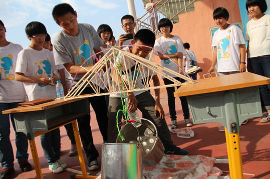 在接下来模型搭建的时间里,孩子们亲自动手加工木材、设计模型,再把一个个小木板粘合在一起,把设计变成了他们手中的模型。孩子们一边展示自己的成果,一边与大家分享自己的创造过程。在检测了孩子们的模型作品后,东南大学指导老师李昕说:“这些孩子做得非常棒,想象力非常丰富,他们利用三角形和弧形的稳固性,在模型加载评分测试中超出了我制定的标准。此外,他们的手工也做得非常精细,这些表现都出乎了我的意料。”模型搭建冠军组的组长王雨祥兴奋地对记者说:“我们非常喜欢科学知识,对这些未知神秘的创意充满好奇。我们也曾参加过比赛,做过‘隐形鼠标手’、‘机器人’等小作品,希望通过这次锻炼能学到更多有用的知识,满足我们求知的心愿。”参与比赛的孩子们还将夏令营的口号选定为“把心中的梦追到底!”